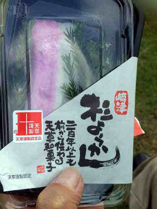 ここでしか売っていない杉ようかん。食べてみると、ういろうの中にあんこが入っている様でした。 ちなみに、一日しかもたないそうです。 |