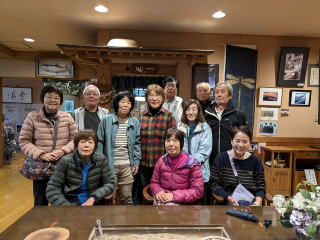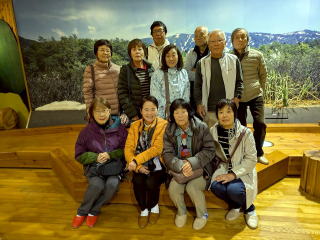 凄く長いトンネルを抜けて「奥只見湖」へ行きましたが、私達がトイレに行っている間に、最後の遊覧船が終わっていまって、結局乗れませんでした。残念、知っていればトイレは我慢したのに。 | エコミュージアムで撮ってもらった、今回の旅行の参加者。今回は、初めて藤本さんが参加して下さり、運転を変わってもらえたので、とても助かりました。 |