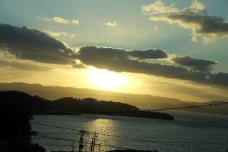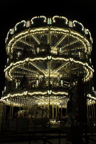 夕日を激写、ハウステンボスに向かう、バスの中から撮りました。 | ハウステンボスの中。3階建てのメリーゴーランド。頑張って、3階に乗ってきました。佐世保バーガーの夕食と、クルーズ船でライトアップしたハウステンボスを満喫、温泉にも入ってきました。 |