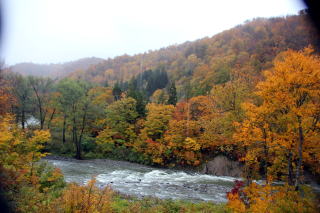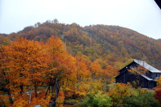| この日泊まった銀山平の宿「湖山荘」の窓から見えた紅葉と川 川の音が心地よかったです。 あいにくの雨、八海山のロープウェイは、諦めました。 |